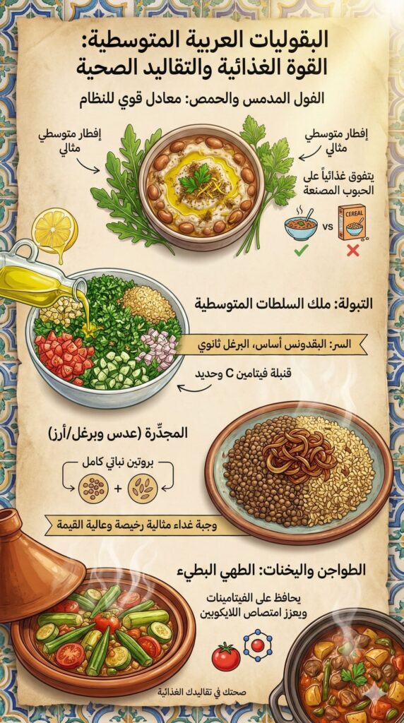 الفول المدمس والحمص: هما المعادل العربي القوي للبقوليات في النظام. طبق فول بزيت الزيتون والليمون والكمون مع الخضروات الورقية هو إفطار متوسطي مثالي، يتفوق غذائياً على حبوب الإفطار المصنعة.
